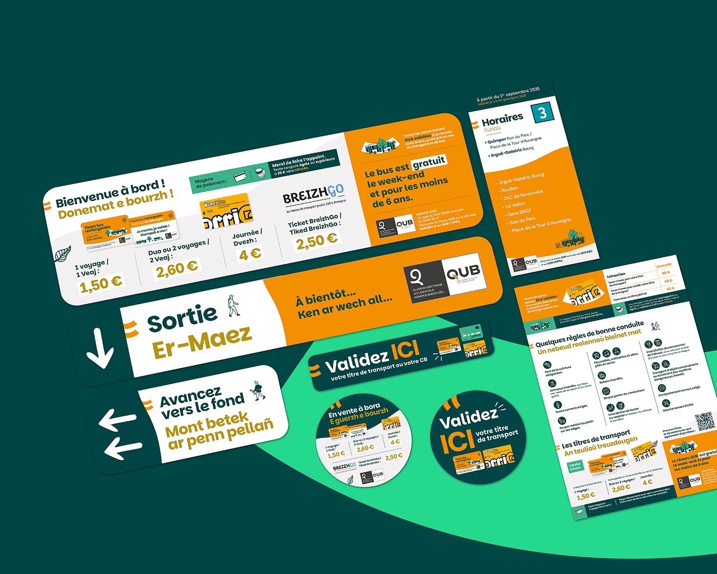 Comment rendre l’information voyageur plus lisible, plus cohérente et plus moderne, sans perturber les habitudes des usagers ? C’est la question posée par le réseau QUB – RATP DEV Quimper à l’agence Rivacom, qui souhaitait repenser sa communication “Information Voyageur” afin d’unifier et de moderniser son image.