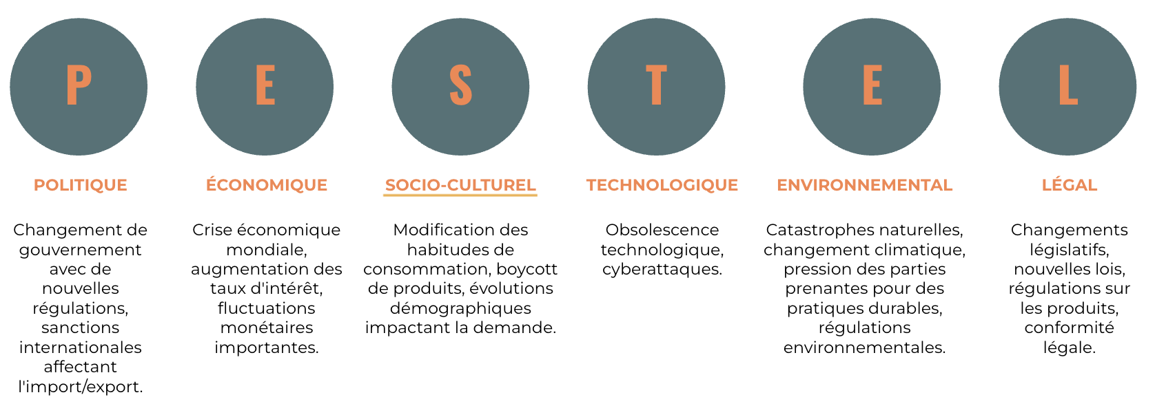 Créer des livrables concrets est essentiel pour une gestion efficace en cas de situation critique. Le premier livrable clé est la cartographie des risques potentiels, qui permet d’identifier les menaces internes et externes auxquelles l’entreprise pourrait être confrontée. Pour cela, on peut utiliser le modèle PESTEL pour répertorier les risques externes en fonction de 6 thématiques identifiées :